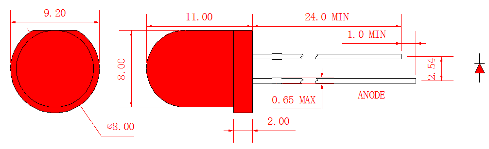 Lámpara LED redonda roja de 8 mm (LL80UDR2D40-150)